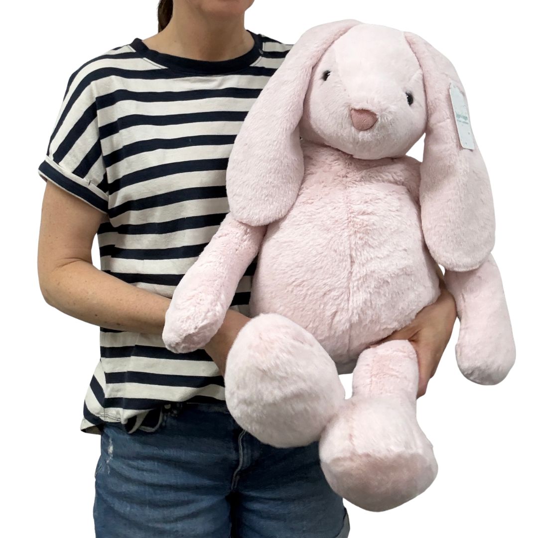 The Extra Large Pink Bunny from Jiggle & Giggle is an oversized bundle of love, designed to bring joy, comfort, and cuddles to little ones (and the young at heart!). With its luxuriously soft blush-pink fur, floppy ears, and sweet, friendly expression, this giant bunny makes an unforgettable gift and a beautiful addition to any nursery or playroom. Lovingly crafted from ultra plush fabrics with child-safe trimmings, this bunny is made for snuggles and everyday companionship. Its extra large size is perfect for big hugs, cozy moments, and comforting cuddles – whether it’s a quiet nap time or a playful adventure. Whether it’s for a birthday, baby shower, or simply to show some love, the Extra Large Pink Bunny is a heartwarming gift for children and bunny-lovers of all ages. • Luxuriously soft pink plush fur for ultimate comfort • Extra large size – ideal for big hugs and display • Floppy ears and sweet, huggable design • Weighted beanie bottom for stable sitting • Child-safe trimmings for peace of mind • Available personalised with name embroidery on one or both ears • A treasured gift for newborns, toddlers, and bunny enthusiasts Wrap someone special in love with the Extra Large Pink Bunny – a super-sized cuddly companion designed to inspire warmth, smiles, and endless affection.
