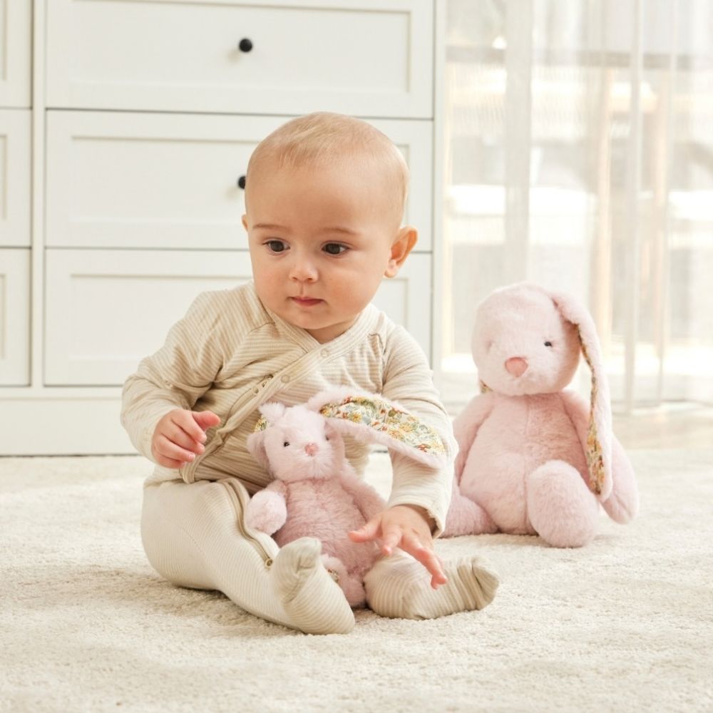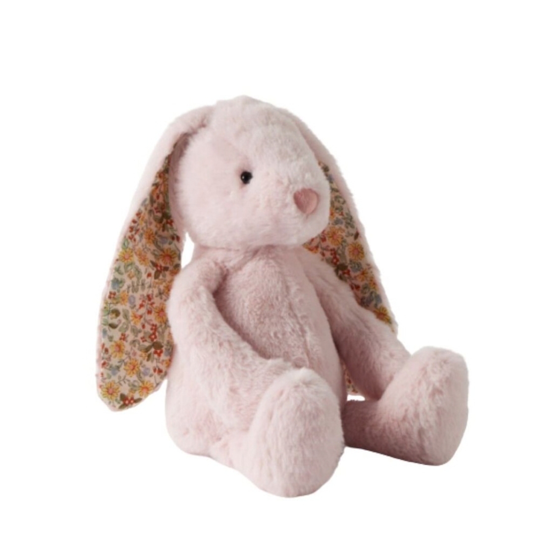 FLORAL PINK BUNNY MEDIUM SOFT PLUSH TOY - JIGGLE AND GIGGLE This lovable bunny is the perfect companion for newborns and toddlers! Made from ultra-plush fabric, featuring beautiful floral detailed ‘ditsy’ ears and child-safe trimmings, little ones will love the feel of its irresistibly soft fur, making it great for cuddles. This bunny also loves going on adventures and can be carried around by its floppy ears, which are the perfect size for little hands to hold.